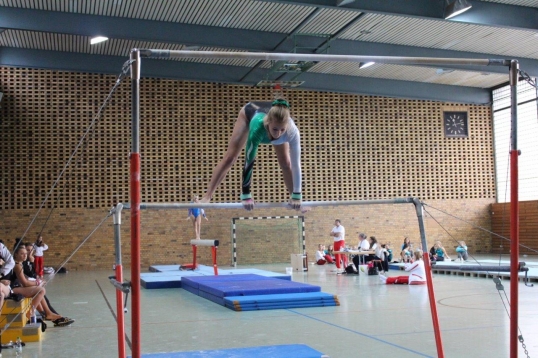 Begonnen wurde der Wettkampf zuerst am Stufenbarren und anschließend am Schwebebalken. Leider mussten an beiden Geräten Stürze der Turnerinnen hingenommen werden. Trotz alledem zufrieden mit den Leistungen ging es weiter an den Boden. Wusste man doch, dass die Wertungen aller Turnerinnen sehr eng beieinander lagen, und es auf jedes Zehntel für die Endplatzierung ankam.