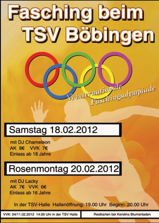 Für den heutigen Rosenmontagsball gibt es noch Karten für 7 Euro an der Abendkasse. Hallenöffnung 19.00 Uhr, ab 20 Uhr wird das Programm für die närrischen Gäste erneut gezeigt, im Anschluß legt DJ Lacky auf, der schon traditionell beim Rosenmontagsball nicht fehlen darf. Auch die Remstalgugga Bäbenga werden mit "schiefen" Tönen die Halle erzittern lassen.