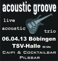 Nach einem Jahr Pause ist es endlich wieder soweit. Eine Partynacht der echten Superlative steigt am 06. April 2013 in Böbingen. Acoustic Groove spielen in der TSV-Halle Unplugged Songs von Eric Clapton über Simon & Garfunkel bis Bon Jovi.