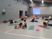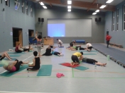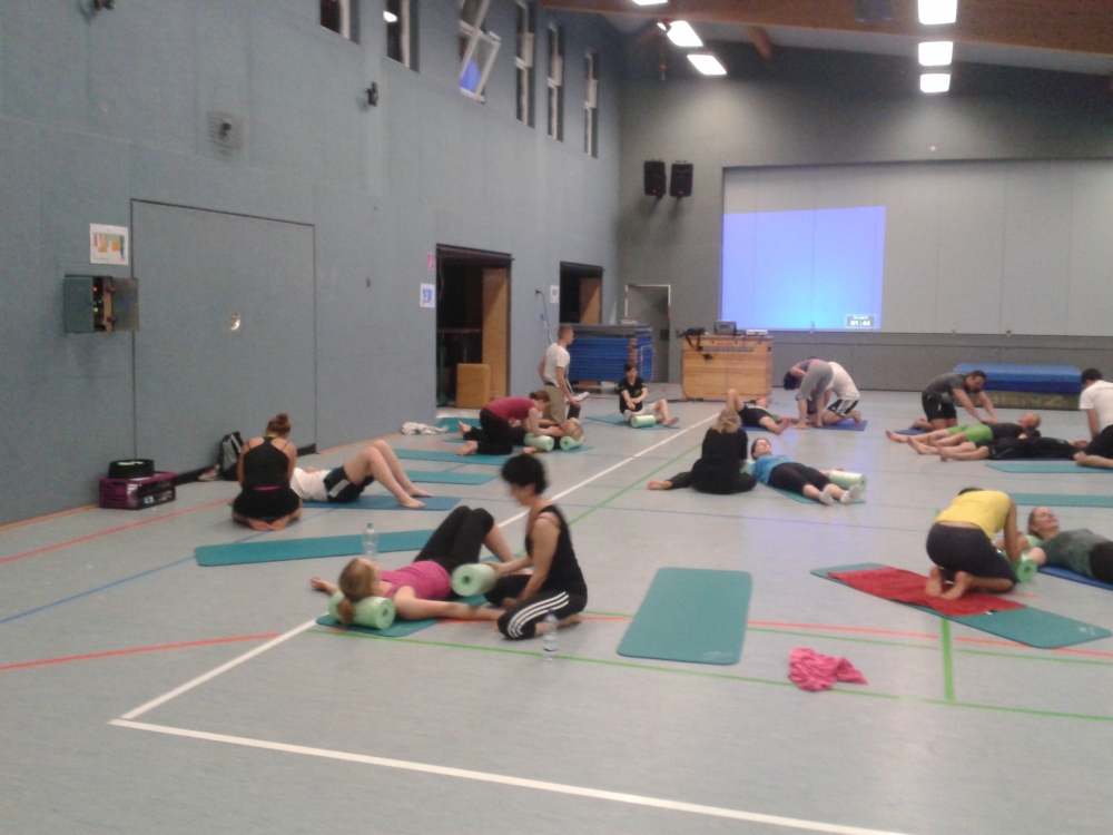 Daraufhin haben wir das Ganze mit der sogenannten "Blackroll" praktisch erarbeitet. Ein Training der Faszien, welches nach jedem sportl. Training oder auch Wettkampf die Regeneration unterstützt, aber auch Sportverletzungen vorbeugt und ganz wichtig, den Körper auf eine andere "neue" Weise dehnt.