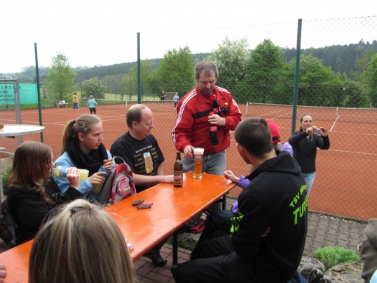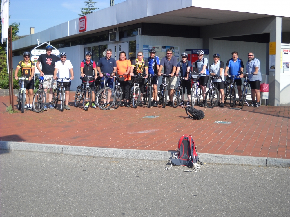 An Fronleichnam machte sich die Männergarde mit Freunden und Fahrrädern auf große Tour. Vor der Abfahrt am Bahnhof hatte Ewald bereits einen Plattfuß. Pünktlich um 9 Uhr waren alle startklar und es ging mit dem Zug Richtung Ellwangen. Über Schrezheim und Limestor Dalkingen wurde der Rainau-Buch-Stausee zu einer ausgiebigen Pause angesteuert. Danach Weiterfahrt Richtung Hüttlingen, Kochertal und Niederalfingen. Kurz vor Waiblingen hatte Karle einen doppelten Plattfuß. Auch das wurde fachmännisch behoben. Über Abstgmünd, Leintal nach Laubach zur wohlverdienten Mittagspause. Anschließend kurzer Besuch in Heuchlingen bei der Gazelle Dany. Richtung Holzleuten und Limes dann über den Gratwohl nach Böbingen zur TSV Halle. Dort wurde der Tag mit einer Grillparty und Freibier ausgiebig ausklingen lassen.