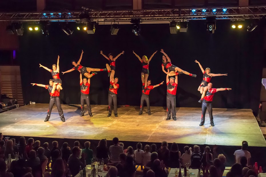 Nach der kurzweiligen Pause übernahmen die Tänzerinnen des TSV unter dem Motto „Dance the time warp“ den noch anhaltenden Spannungsbogen und nahmen uns mit auf eine Zeitreise durch die vergangenen Jahrzehnte. Auf die bekannten Lieder von Elvis Presley zeigten die Tanzmädels was sie drauf haben. Danach nahm „Dark Destination“ das Publikum mit in die 70er Jahre. Die Tanzgruppe „Time2Dance“ löste mit ihrer Flashdance- und Aerobicnummer beim Publikum ein prickelndes Erlebnis aus. Die 90er wurden von der Tanzgruppe „Crazy Dancers“ vertreten. Zu Ehren des Todes von Michael Jackson widmeten „Delicious“ ihm ihren Tanz. Abschließend wurden die Zuschauer von allen Tanzgruppen, mit dem aktuellen Hit „Timber“, zurück in die Gegenwart geholt.