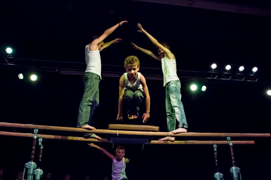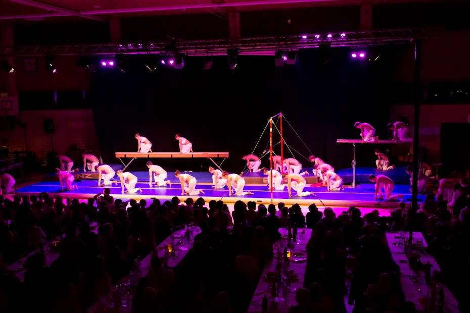 Darauf folgte der absolute Höhepunkt des Abends mit den Ligaturnerinnen und -turnern des TSV Böbingen, die sich zur Gruppe „United“ vereinten. Mit ihrer spektakulären Show am Barren, Balken, Hochreck und der neuen Airtrack brachten sie die Halle zum Brodeln. Mit ihren muskulösen Oberkörpern boten sie nicht nur etwas fürs Auge, sondern begeisterten zudem mit waghalsigen Sprüngen, Salti und Schrauben. Auf eindrucksvolle Weiße wurden zwei der Turner an Seilen bis ans Hallendach gezogen, wo sie direkt über den Köpfen der Zuschauer ihr Können an den Ringen zeigten.