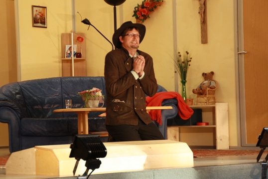 Im Mittelpunkt steht aber zunächst eindeutig Hans Dipfele (Uwe Eßwein). Romantisch sei er gewesen, erfährt das Publikum gleich zu Beginn von seiner Frau Erna (Monika Eberle). Ernas Vater Emil (Roland Barth) hingegen schimpft, Hans habe ihm immer den Most geklaut und sei ein Säufer gewesen. Auch von Geldschulden und einem „sündigen Leben“ ist die Rede. Derjenige, über den geschwätzt wird, kann sich übrigens nicht wehren: Hans Dipfele ist tot und eben erst beerdigt worden. Alle Darsteller tragen Schwarz. Ein Einstieg mit Beerdigung – und das soll eine Komödie sein? Die Lacher in der TSV-Halle in Böbingen sind Antwort genug. Die Gaukler, die in dieser Theatersaison ihr 25jähriges Jubiläum feiern, schaffen es, dem auf den ersten Blick traurig wirkenden Stoff viele witzige Facetten abzugewinnen und die TSV-Halle in ein vom Publikum Tränen lachendes Tollhaus zu verwandeln.