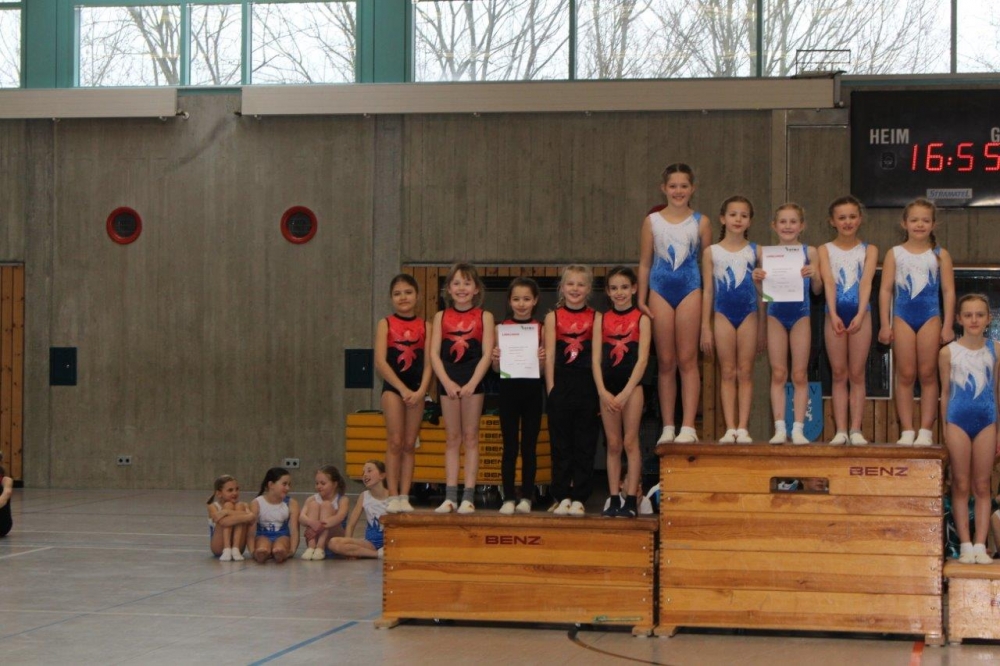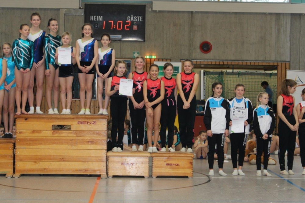 Die Konkurrenz war groß und das Niveau sehr hoch, da man bei diesen Wettkämpfen um die Qualifikation für die Landesfinals turnte. Unsere weibliche E-Jugend-Mannschaft startete sehr gut in den ersten drei Geräten und war bis zum letzten Gerät auf einem Podestplatz. Doch dann kam der Balken und man verlor einige wichtige Punkte, sodass es nur noch für den 6. Platz reichte. Bei der C-Jugend-Mannschaft war es genau andersrum. Die Mädels taten sich etwas schwer mit dem Gerät Reck in den Wettkampf zu finden. Bei den drei anderen Geräten konnte man jedoch dann die erwünschte Leistung abrufen. Dennoch verpassten sie knapp das Podest und platzierten sich auf dem 4. Platz.