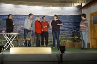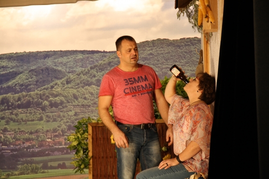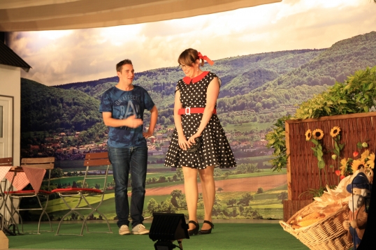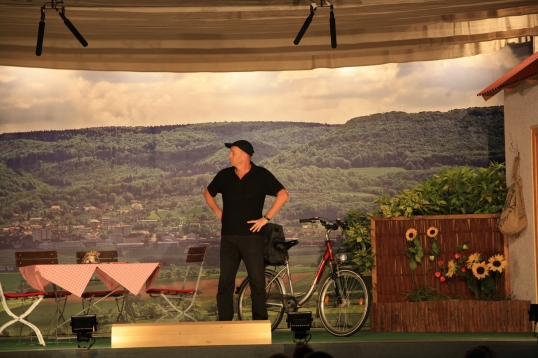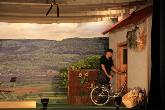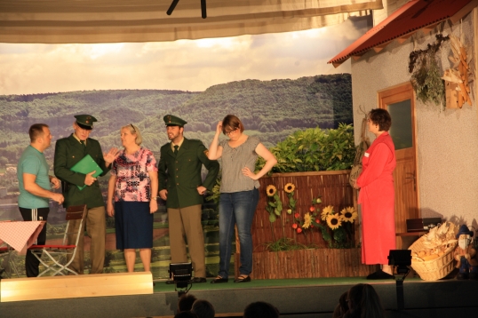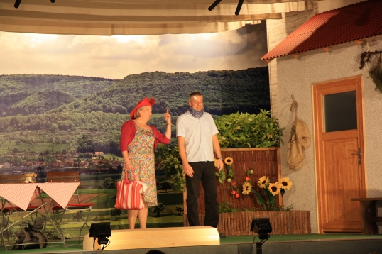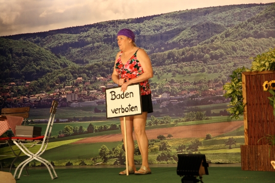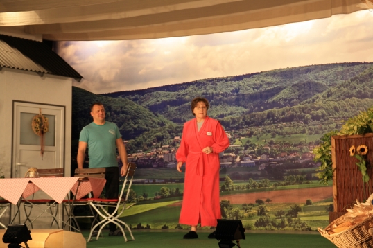 Für die heitere Kriminalkomödie hat die Theaterspielgruppe wieder eine schöne, stimmige Bühnenkulisse aufgebaut, was natürlich auch wichtig ist, damit die Story richtig realistisch rüberkommt. Man glaubt fast, man sitzt selbst vor dem Haus am schönen Sternsee-Ufer, wo die Geschichte spielt.