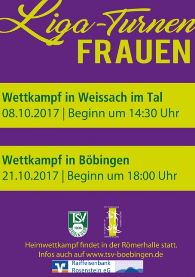 Den ersten Wettkampf bestreiten die Turnerinnen am Sonntag, den 08.10.2017, in Weisach im Tal. Der zweite und damit entscheidende Wettkampf wird in Böbingen am Samstag, den 21. Oktober 2017, ausgetragen.
