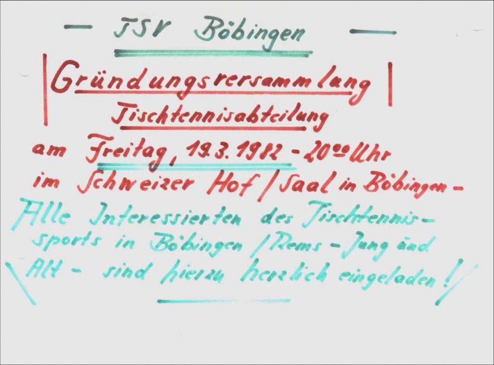 Auf den folgenden Unterseiten soll festgehalten werden, was in den vergangenen Jahren in der Tischtennis-Abteilung so alles passiert ist. Mit einem kleinen Stück Papier, das 1982 im "Kästle" ausgehängt wurde, begann alles.